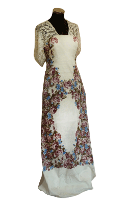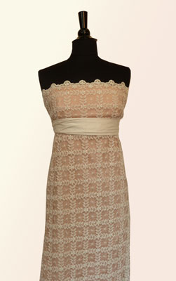 Blazer aus Spitze auf Satin gearbeitet - Etuikleid aus Dupionseide - Spitzenkleid mit zweifarbigem Unterkleid - Marlenehose mit Mantel aus Organdy und Chiffonrosen
